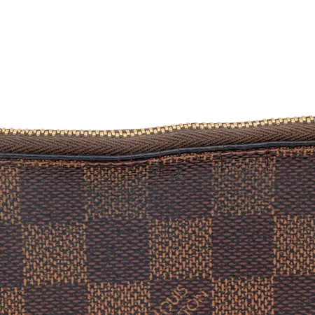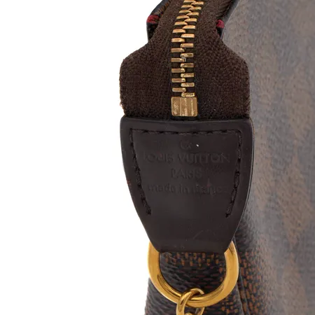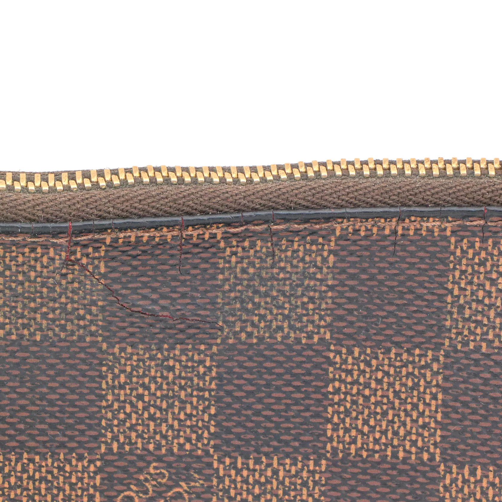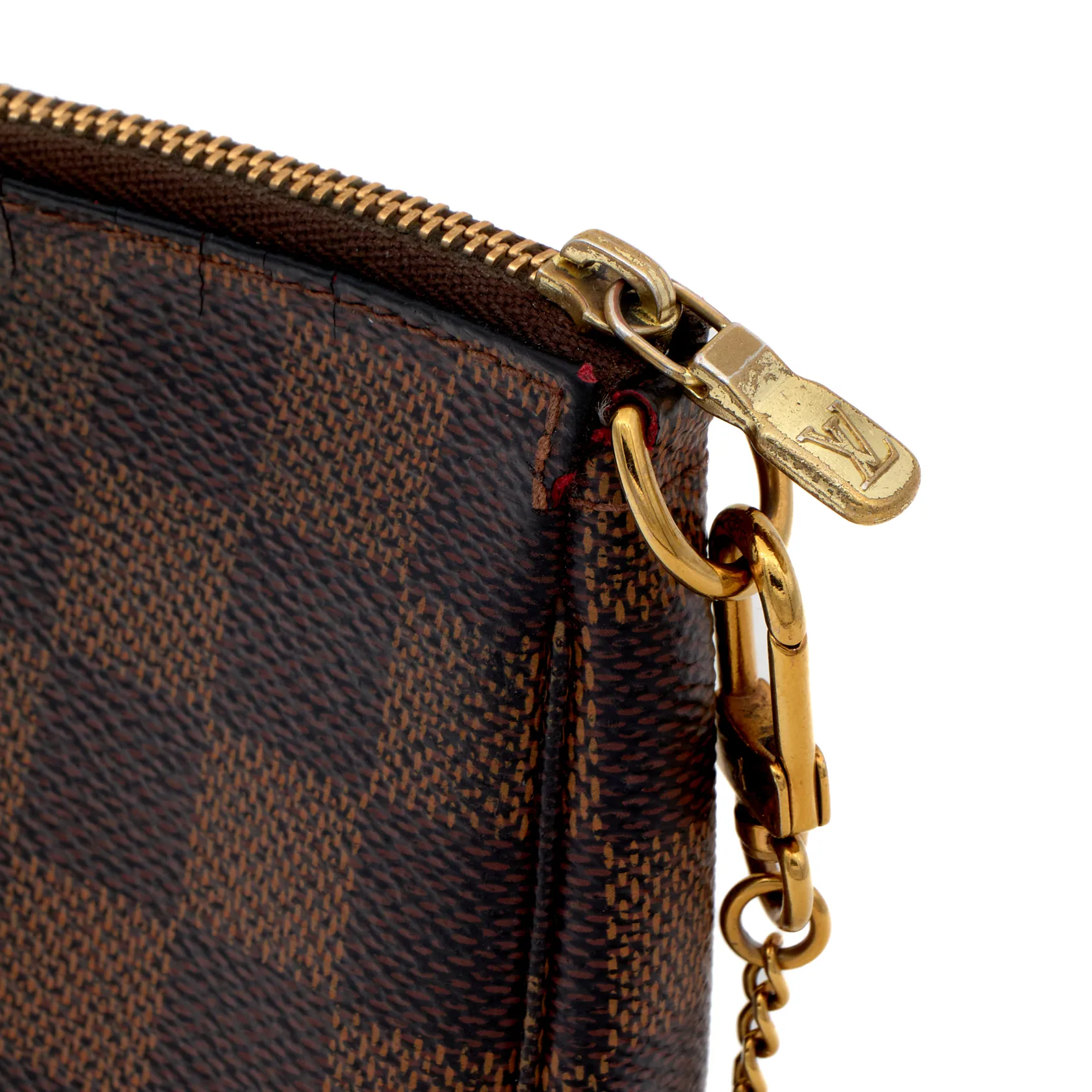 Käsilaukku Louis Vuitton, Mini Pochette Accessoires Damier Ebene Canvas, N58009, Made in France, selviä käytön jälkiä, toisella puolella nahkassa 2,4cm halkeama, ostokuitti Louis Vuitton Helsinki 22.12.2016, dustbag ja laatikko. Paino: 0 g