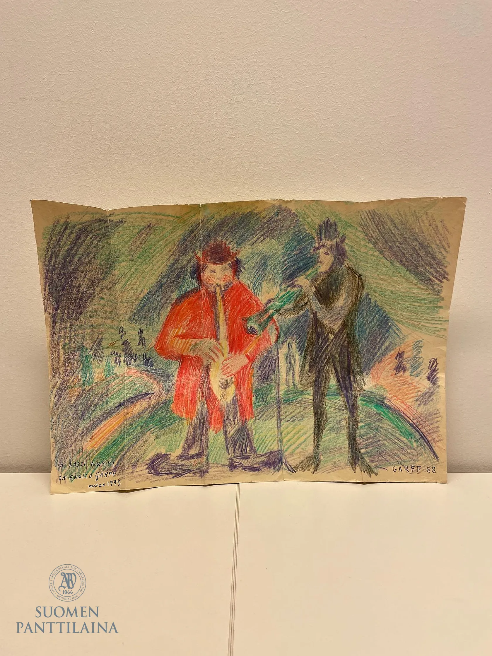 Väriliitutyö, A Lassi Nummi DA Enrico Graff matzo 1995, signeerattu Garff 88, taiteltu, korkeus 34cm, leveys 48cm. Paino: 0 g