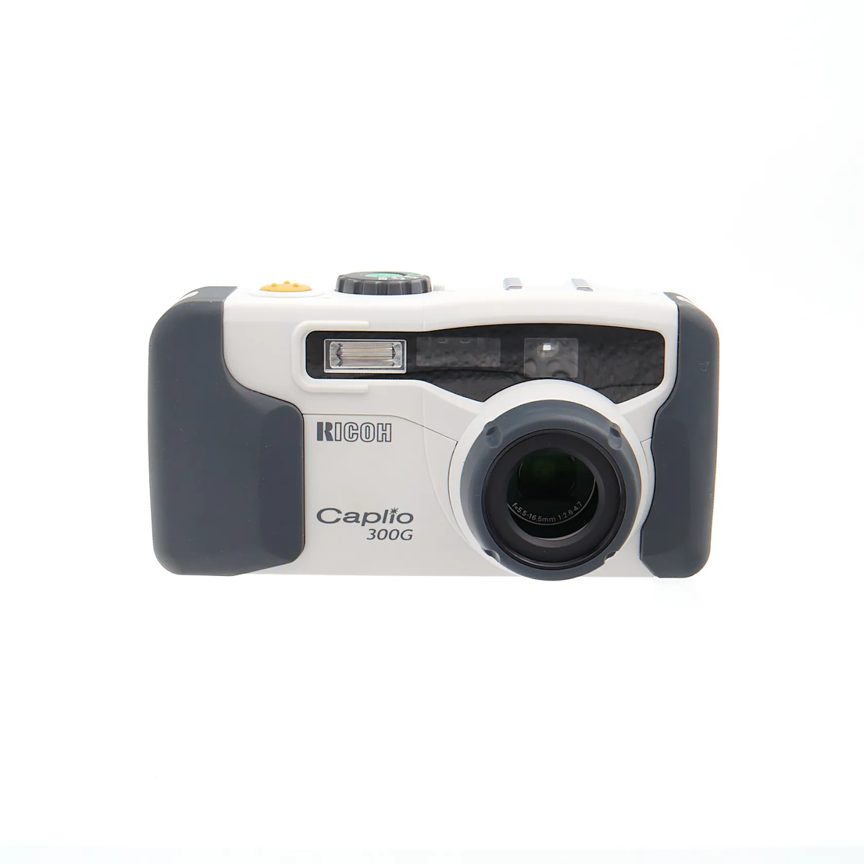 Kamera Ricoh Caplio 300G 5.5-16.5mm 1:2.6-4.7, akku puuttuu, rannehihna ja kaksi kaapelia, laatikko.